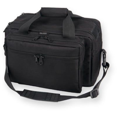 Constructed of durable, water-resistant 1000D nylon, the Bulldog Cases® X-Large Deluxe Range Bag with Pistol Rug is the ultimate range bag for target shooters and all-day tactical training sessions. The extra-large, zippered main compartment readily stows any combination of pistols, ammunition, ear and eye protection, cleaning kits, spare magazines, and other essential gear, while multiple interior pockets keep your gear organized for added convenience and quick access. Three zippered exterior pockets offer ample storage space for smaller gear, such as mag loaders and sight tools, while thick padding and the removable pistol rug protect your guns and gear from bumps and drops during storage and transport. Better yet, this range bag features an adjustable shoulder strap for convenient, hands-free carry, and the hook-and-loop carry handle offers versatile carry options. 15″L x 8″W x 10″H. Imported.