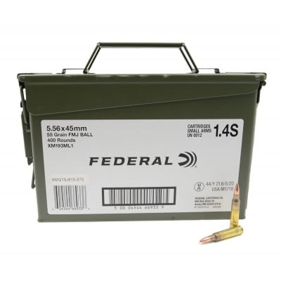 From casual target practice to competition shooting, tactical training, Federal® 5.56 55gr FMJ Ammo is a reliable target round, designed to deliver exceptional accuracy and consistent performance at an affordable price for high-volume shooters. This highly accurate ammo features quality Federal bullets, primers, and components, loaded in premium, reloadable brass casings for dependable field service and consistent performance. 400 rounds. Includes watertight ammo can.