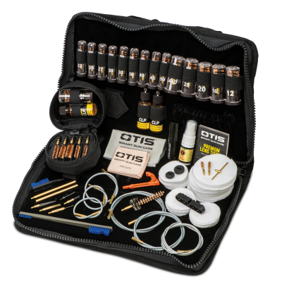Keep your entire arsenal clean and protected from the elements for lasting performance with the Otis® Elite Cleaning Kit. Packed in a 15.25” x 8.75” x 4.5” nylon carry bag, this universal cleaning kit features more than 60 brushes, scrapers, solvents and lubricants, and other tools, delivering a reliable, consistent clean across multiple firearm platforms. 16 caliber-specific bronze bore brushes quickly remove carbon, copper, and lead fouling, while 8”, 12”, and 36” Memory-Flex® cables with thread connectors allow for a quick, single-pass Breech-to-Muzzle® clean. Obstruction removal tools make quick work of blasting away mud, snow, and other performance-inhibiting blockages, while a lens tissue, lens spray, lens brush, and lens cloth keep your optics clear and bright for superior reliability. Other tools include chamber brushes, a pin punch, end brush, straight pick, locking lug scraper, scraper, short AP brush, double-ended AP brush, and male and female rods for a more reliable, precise clean. Plus, this kit includes a microfiber gun cloth, chamber flag, 0.5 fl. oz. Shooter’s Choice FP-10 Lubricant Elite® CLP lube, and instruction manual. Made in USA.
