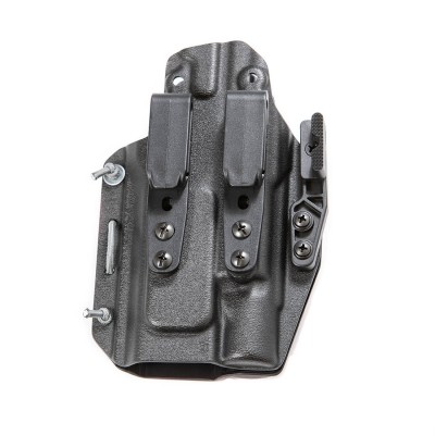 Designed to accommodate pistols with a rail-mounted Surefire® X300 flashlight, the PHLster® Floodlight IWB Universal Holster for Surefire X300 features an adjustable 2-piece design with a side contact, allowing you to adjust the holster to accommodate a variety of handguns while simultaneously providing a snug, reliable fit. Adjustable retention screws allow shooters to tighten or loosen the friction retention to their liking for improved holstering and drawing. Durable, non-marring Kydex® construction protects firearms from bumps, abrasions, and scratches, while the ambidextrous design readily accommodates both right- and left-handed shooters. The low-profile molding eliminates printing for deep concealment. Plus, the interchangeable carry loops and clips allow you to customize the holster to fit virtually any IWB carry technique.