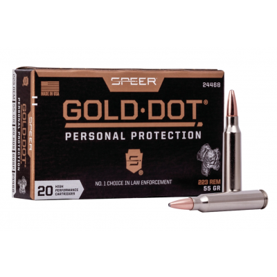The number one choice for law enforcement agencies and defensive shooters across the globe, Speer® Gold Dot® .223 Remington 55gr ammunition is a performance-enhanced target round, designed to deliver exceptional accuracy and unmatched reliability under stress. This ammo features a pressure-formed lead core, bonded to a uniform copper jacket designed to maximize weight retention upon impact for superior knock-down power, while nickel-plated brass casings deliver smooth feeding performance and increased visibility in low-light environments. Better yet, this ammo is loaded with clean-burning powders and propellants, as well as sealed, non-corrosive boxer primers for enhanced reliability in virtually any environment.