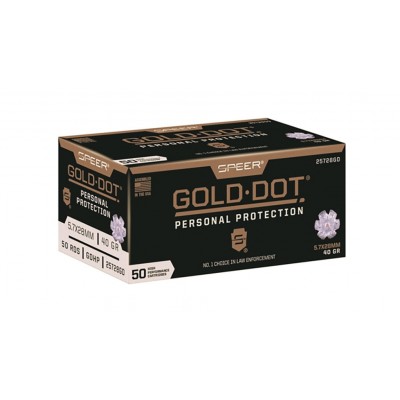 The number 1 choice for law enforcement agencies, military personnel, and defensive shooters across the globe, Speer® Gold Dot® 5.7x28mm 40gr HP ammunition is a performance-enhanced personal defense round, designed to deliver exceptional accuracy and unmatched reliability under stress. This ammo features a pressure-formed Uni-Cor® lead core, bonded to a uniform copper jacket designed to maximize weight retention upon impact for superior knock-down power. Better yet, this ammo is loaded with clean-burning powders and propellants, as well as sealed, non-corrosive boxer primers for enhanced reliability in wet weather environments.