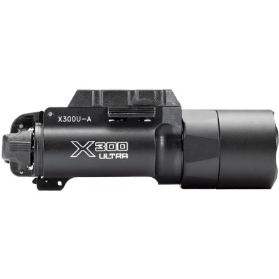 Favored by elite military and law enforcement units, the Surefire® X300U-A Weaponlight is an ultrareliable weapon-mounted tactical light, designed to deliver exceptional clarity and lasting field service in virtually any tactical environment. Featuring a virtually indestructible LED emitter and operating on two 123A lithium batteries (included), this flashlight boasts an impressive 1,000-lumen maximum output, delivering up to 1.25 hours of consecutive use at full power. The proprietary TIR lens offers a focused beam of bright white light out to 213 meters, while the aircraft aluminum low-profile mount securely attaches to most Picatinny-style rails for exceptional reliability and quick, field-ready performance. Ambidextrous push-button controls offer quick operation for intuitive target acquisition and reliable light discipline. Better yet, this flashlight features an impact-resistant, optics-coated polycarbonate lens for scratch-free field performance in virtually any environment.). IPX7 waterproof. Compatible with pressure-activated DG and XT remote switches (not included) for precise weapon control.