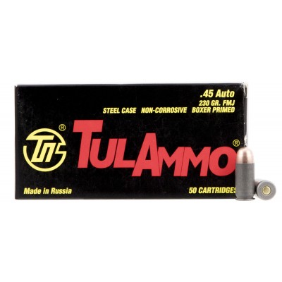 Tired of looking for quality target ammo at an affordable price? Look no further! Tulammo® .45 ACP 230gr FMJ ammo is an affordable, yet reliable target load, designed to deliver exceptional accuracy and consistent performance—without breaking the bank. Featuring steel casings, non-corrosive boxer primers, and Tula-cast FMJ bullets, this economy-priced pistol ammo is the perfect choice for volume target shooters and informal training applications. 50 rounds.